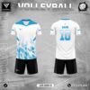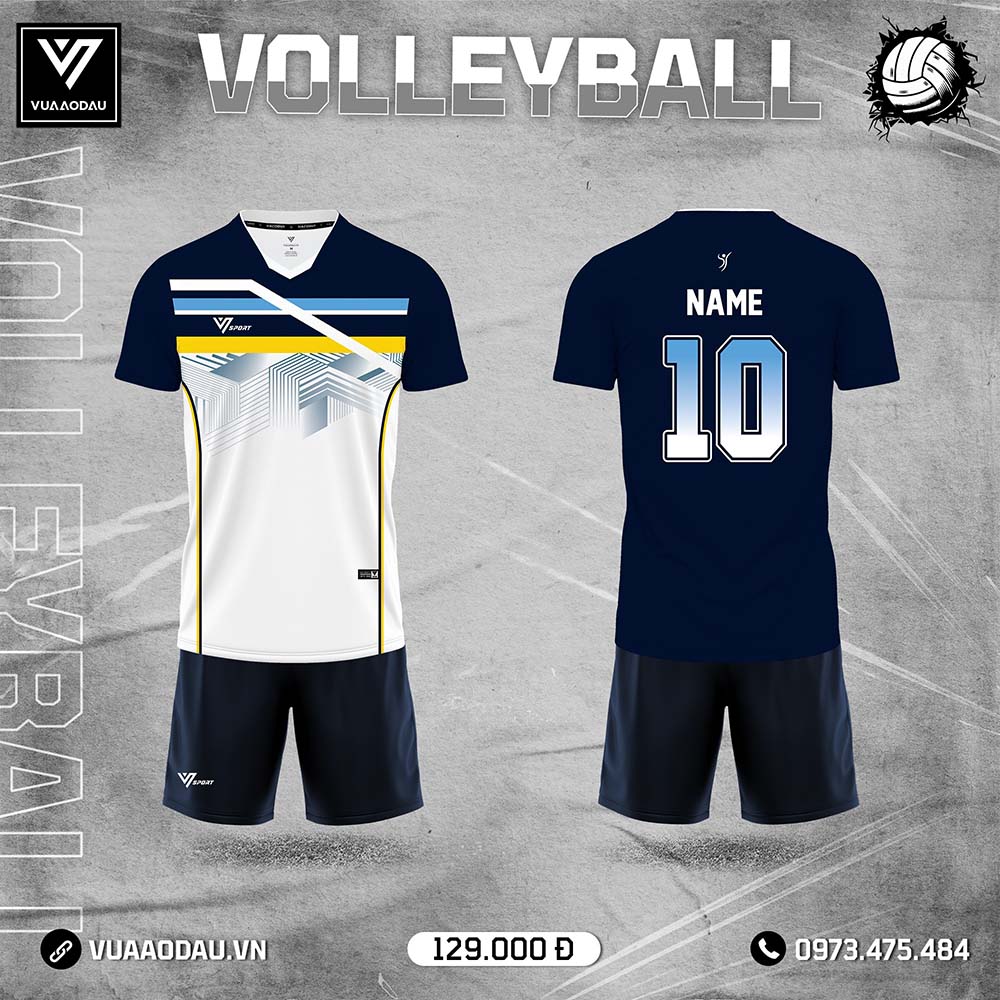 Bộ áo bóng chuyền nam phối trắng và xanh navy nổi bật với thiết kế hình học hiện đại, chất liệu thể thao cao cấp thấm hút tốt, co giãn linh hoạt – lựa chọn hoàn hảo cho mọi trận đấu.