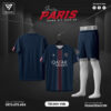 Logo CLB, logo hãng tài trợ và chữ in trắng nổi bật trên nền sẫm màu giúp tổng thể bộ trang phục trở nên tối giản nhưng cực kỳ thu hút. Đi kèm là vớ trắng sọc xanh – một điểm nhấn hài hòa với thiết kế của áo, giữ được nét truyền thống nhưng vẫn hiện đại.