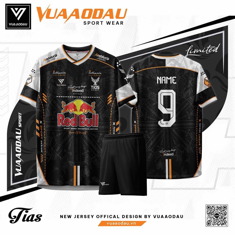 Sự hòa quyện màu sắc khéo léo còn được nhấn mạnh qua logo Red Bull nổi bật, vạch sọc giữa áo và viền tay màu trắng, tạo nên vẻ ngoài thể thao chuyên nghiệp cùng tính nhận diện cao trong từng trận đấu.