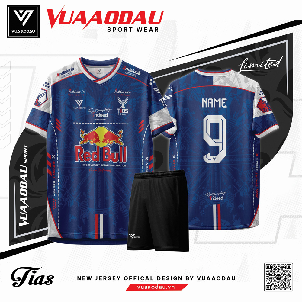 Thiết kế với tông màu xanh navy chủ đạo kết hợp sắc đỏ – trắng nổi bật, áo bóng đá Tias phiên bản Red Bull mang lại diện mạo mạnh mẽ, chuyên nghiệp và cảm giác thoải mái tuyệt đối cho người chơi thể thao.