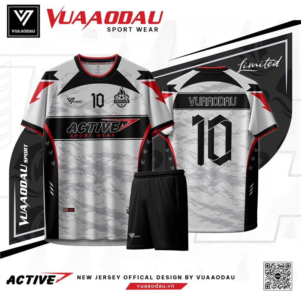 Mẫu áo bóng đá ACTIVE màu trắng bạc phối xám đến từ thương hiệu Vua Áo Đấu nổi bật với thiết kế thể thao chuyên biệt, chất liệu polyester co giãn – thấm hút mồ hôi tốt, tay áo raglan linh hoạt – lý tưởng cho mọi trận cầu.