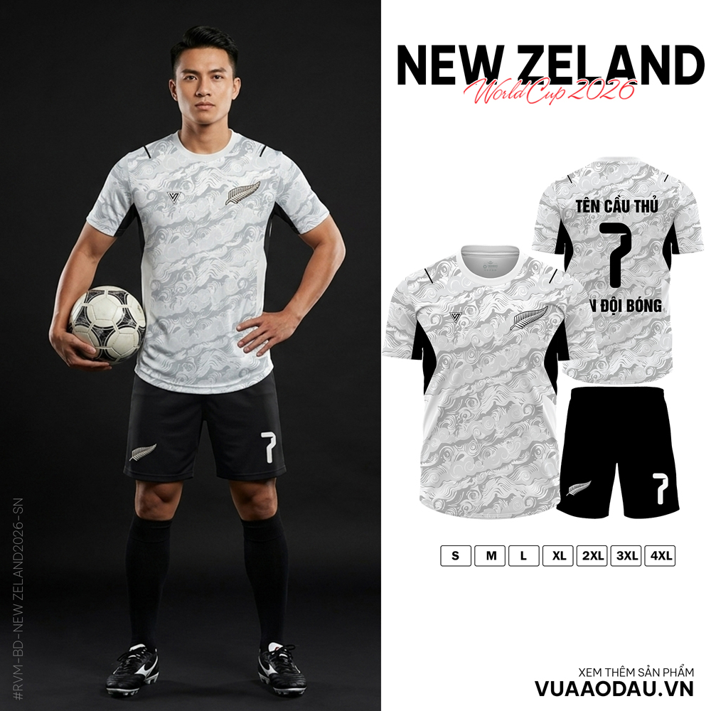 Trải nghiệm chất lượng đỉnh cao, thiết kế nghệ thuật độc đáo và cá tính quốc gia trong từng đường may với áo đấu đội tuyển New Zealand World Cup 2026 màu trắng phối đen.