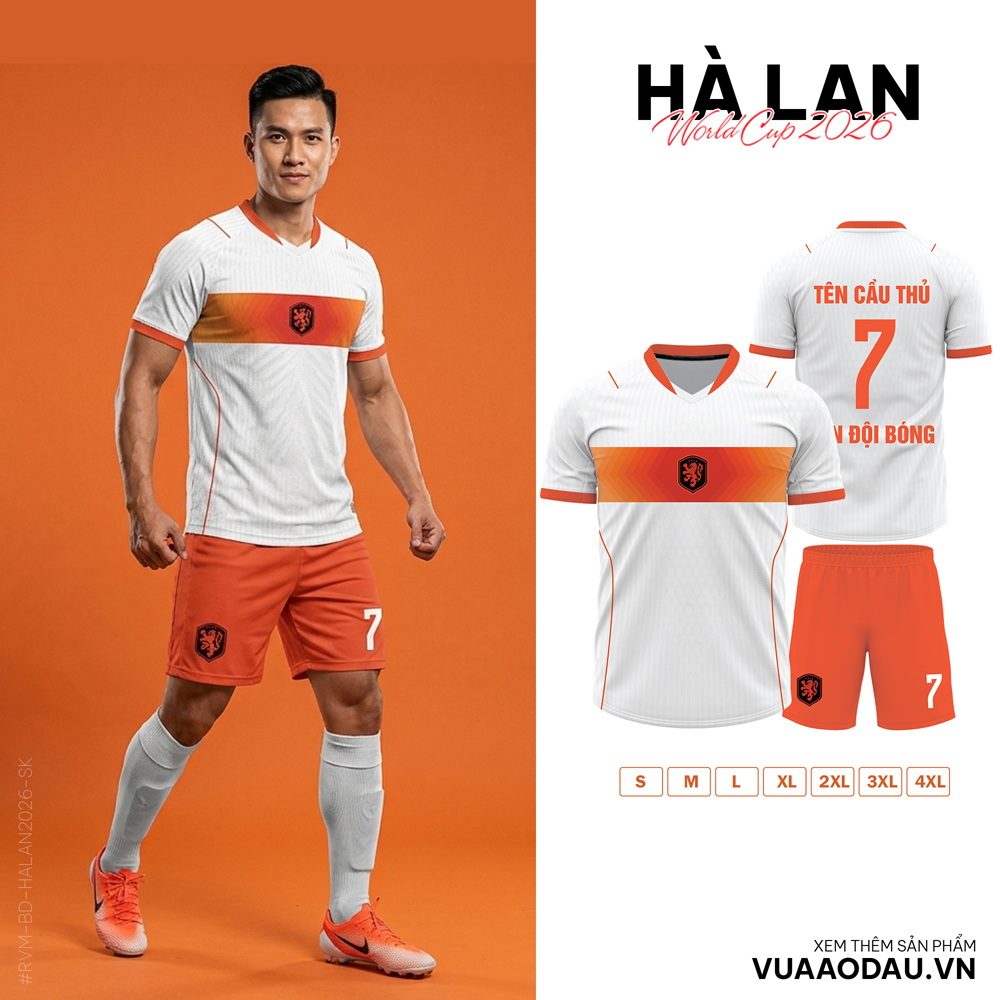 Áo đội tuyển Hà Lan World Cup 2026 phối trắng – cam nổi bật với logo sư tử cam mạnh mẽ, vải thể thao co giãn thoáng khí, thiết kế slim-fit ôm dáng, phù hợp cả thể thao lẫn dạo phố. Chiếc áo không chỉ tôn vinh bóng đá Hà Lan, mà còn giúp bạn tự tin thể hiện phong cách cá tính.