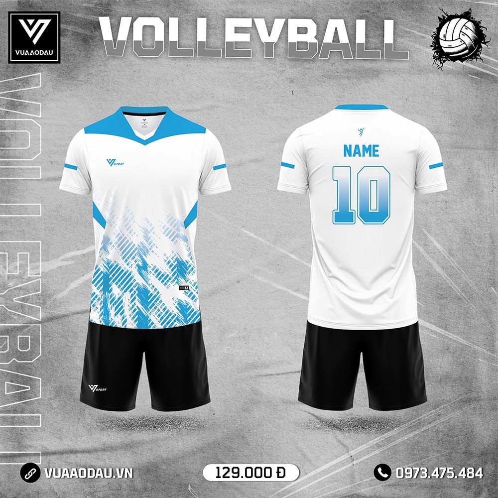Bộ đồng phục bóng chuyền nổi bật với tông trắng phối xanh dương trẻ trung, thiết kế thể thao mạnh mẽ, chất liệu vải chuyên dụng thoáng khí – lý tưởng cho mọi trận đấu.