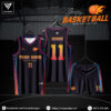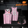 Điểm nhấn đắt giá của mẫu áo là hình ảnh logo quả bóng rổ đang cháy màu cam nổi bật, thể hiện tinh thần thi đấu rực lửa. Font chữ được dùng in tên và số áo mạnh mẽ, rõ nét, nổi bật ngay cả từ xa giúp tăng độ nhận diện cho đội bóng.