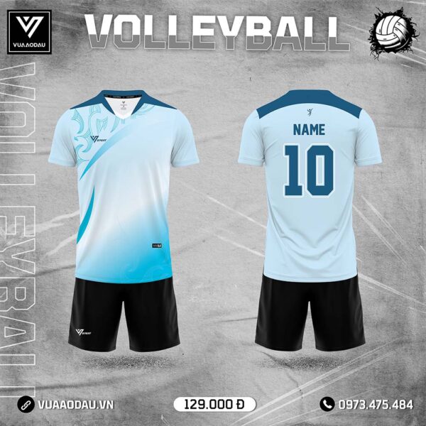 Áo bóng chuyền tay ngắn thiết kế hiện đại với gam màu xanh dương chuyển sắc chủ đạo, chất liệu co giãn và thoáng khí, mang lại sự thoải mái tối đa cho người chơi khi vận động mạnh.