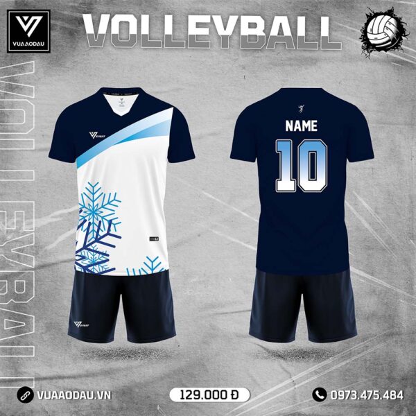 Áo bóng chuyền xanh navy phối trắng thiết kế họa tiết bông tuyết độc đáo, mang lại phong cách trẻ trung, mát mẻ. Chất vải co giãn, thoáng khí lý tưởng cho mọi trận đấu.