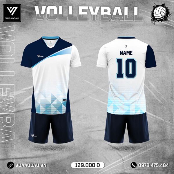 Áo bóng chuyền thi đấu phối trắng và xanh navy, thiết kế unisex hiện đại, thoáng khí, nhanh khô, phù hợp thi đấu và tập luyện cường độ cao.